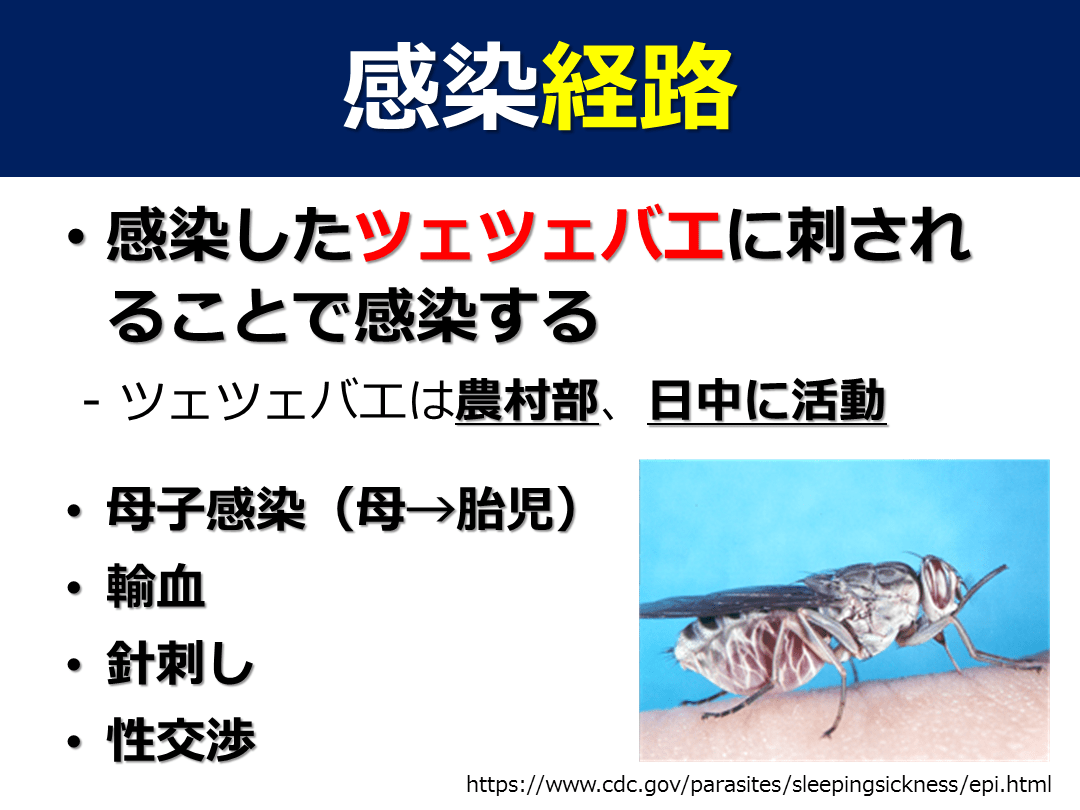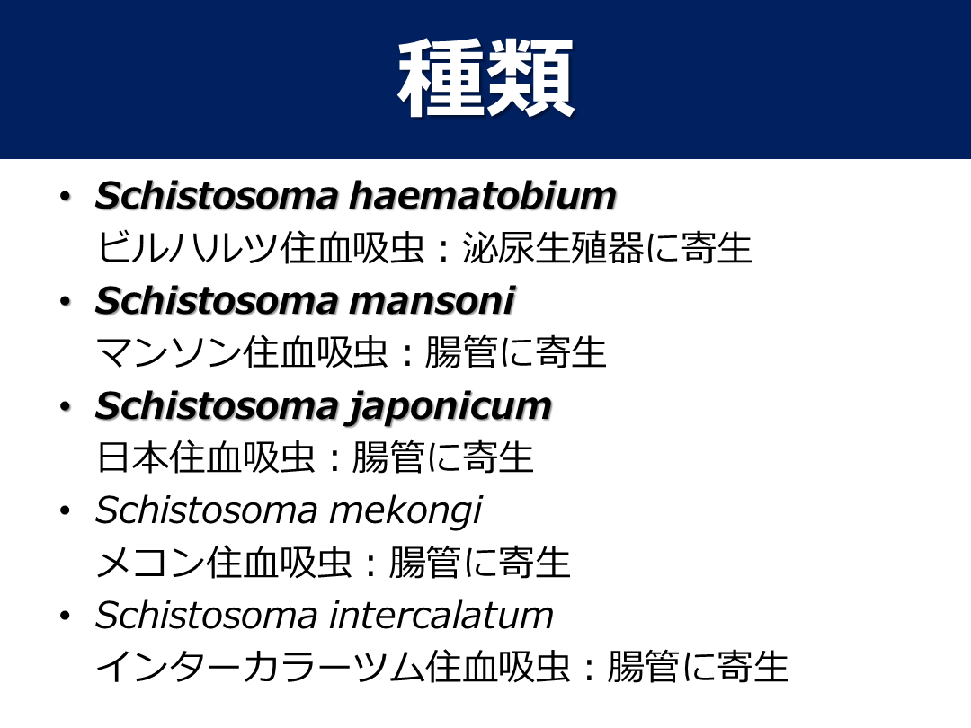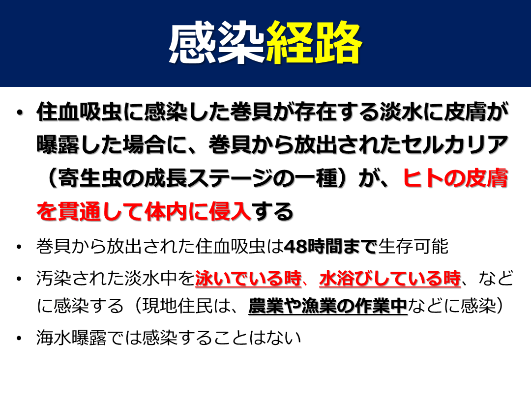 汚染された淡水中を泳いでいる時、水浴びしている時、などに感染する(現地住民は、農業や漁業の作業中などに感染)