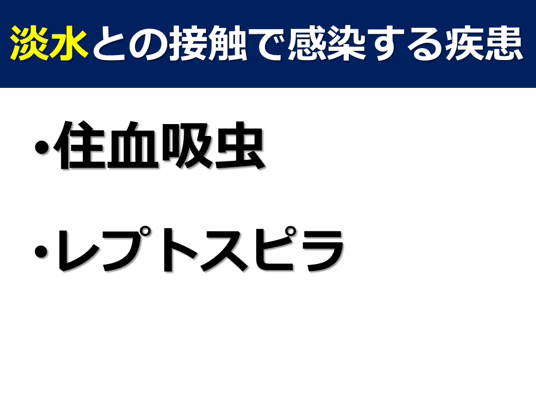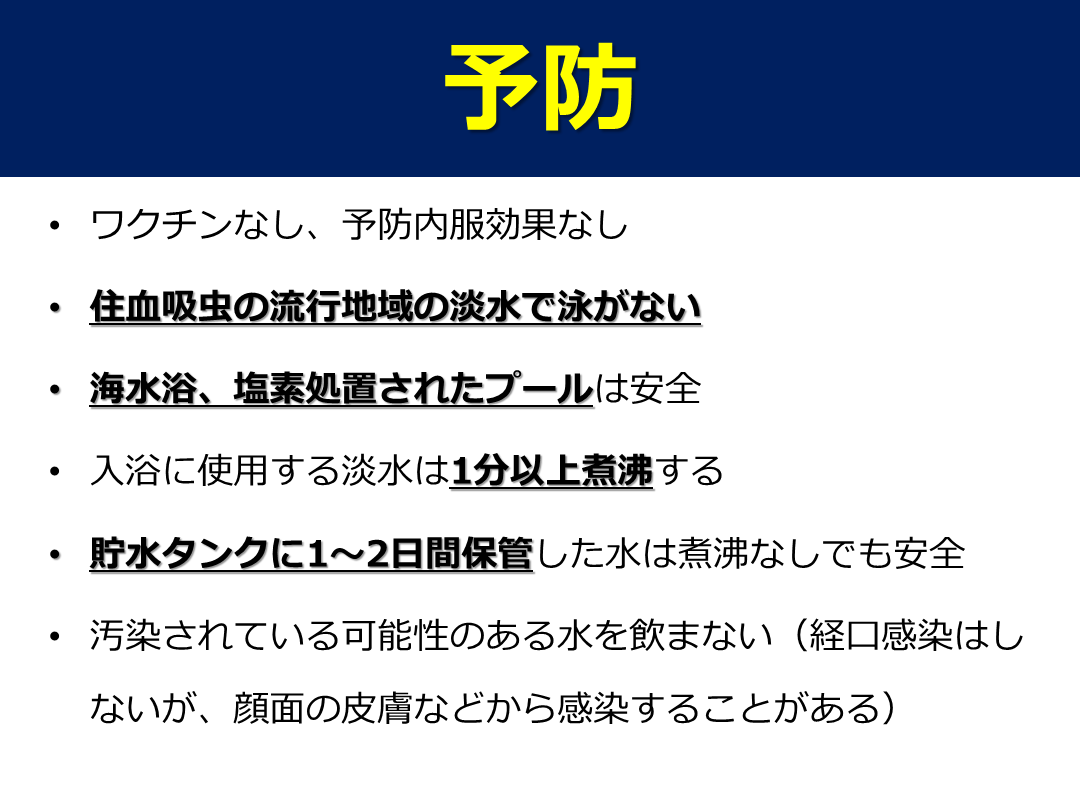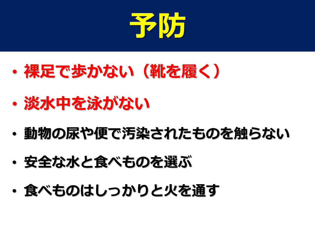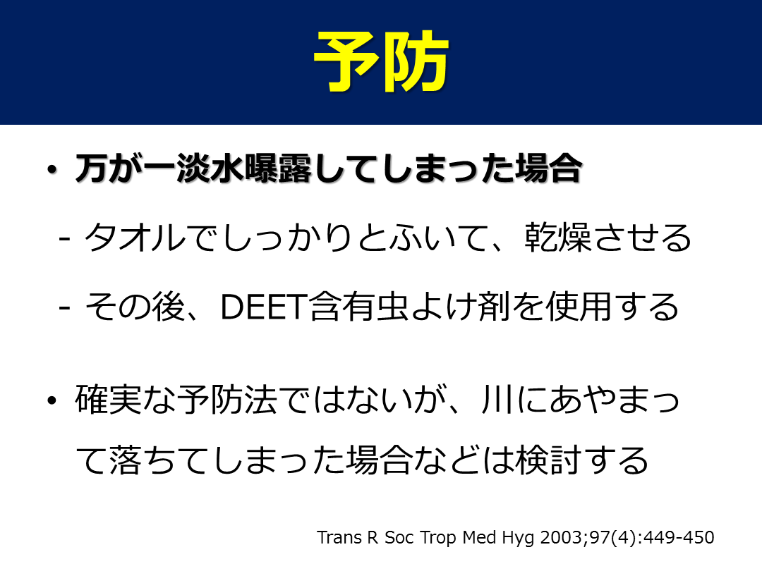 汚染されている可能性のある水を飲まない(経口感染はしないが、顔面の皮膚などから感染することがある)