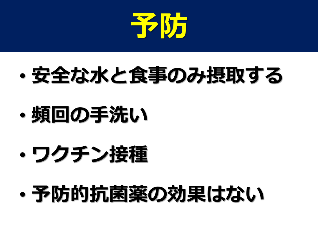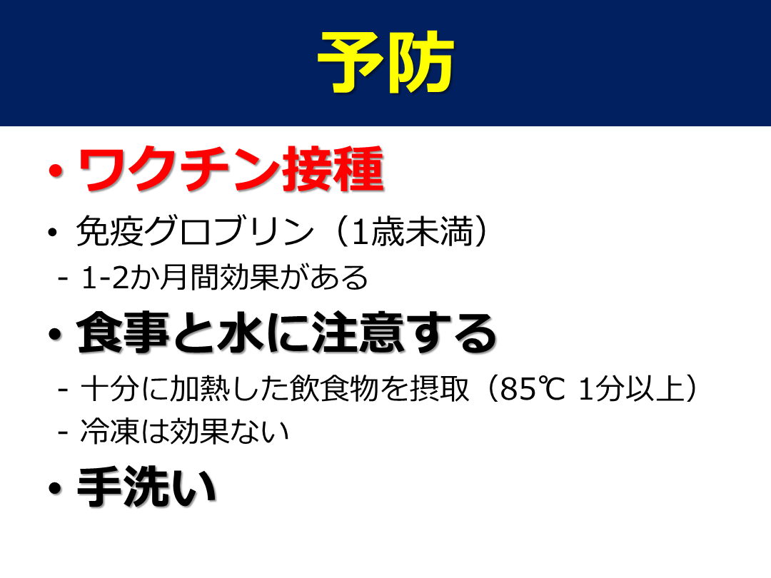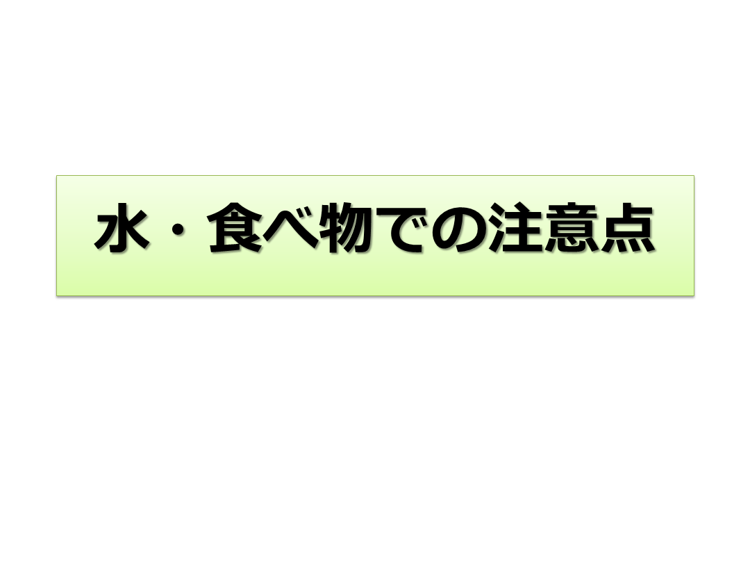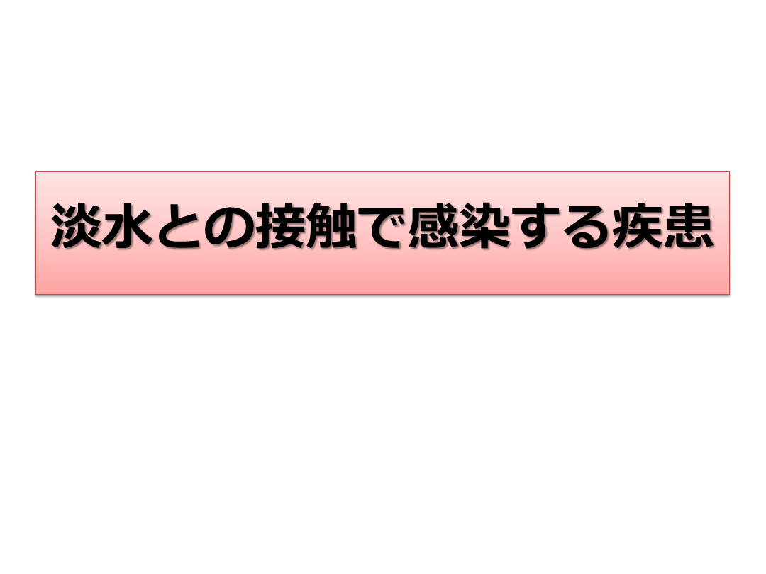 汚染されている可能性のある水を飲まない(経口感染はしないが、顔面の皮膚などから感染することがある)