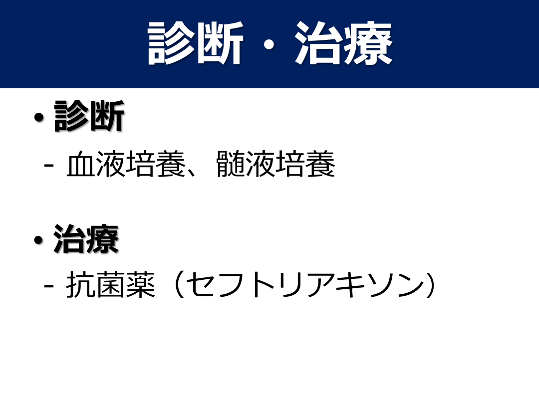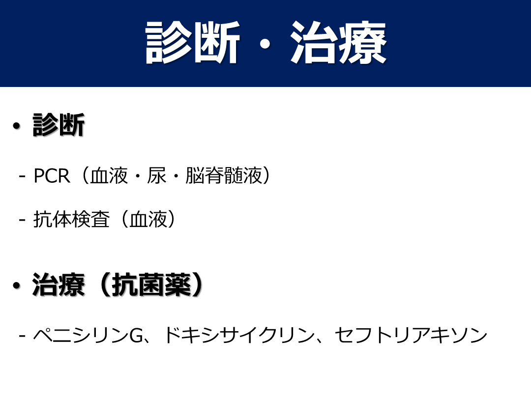 - ペニシリンG、ドキシサイクリン、セフトリアキソン
