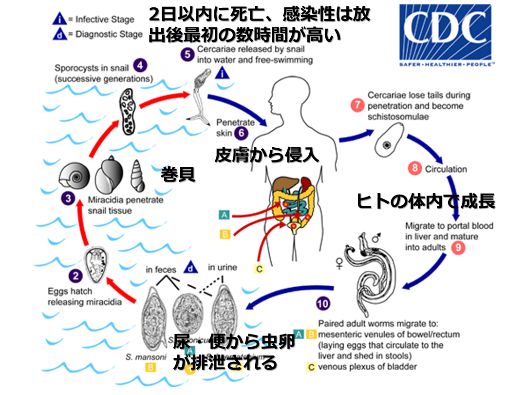 巻貝から放出された住血吸虫は48時間まで生存可能