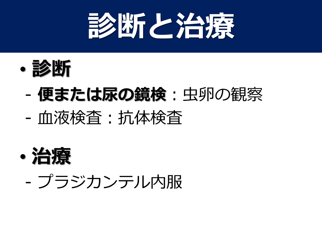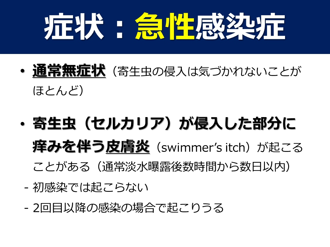 寄生虫(セルカリア)が侵入した部分に痒みを伴う皮膚炎(swimmer’s itch)が起こることがある(通常淡水曝露後数時間から数日以内)