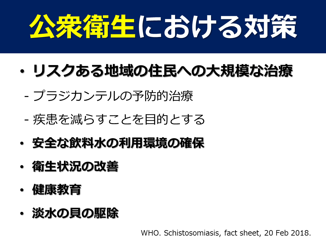 淡水の貝の駆除 WHO. Schistosomiasis, fact sheet, 20 Feb 2018.