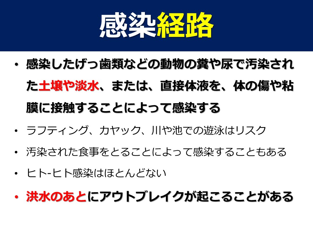 #293. 感染経路 感染したげっ歯類などの動物の糞や尿で汚染された土壌や淡水、または、直接体液を、体の傷や粘膜に接触することによって感染する