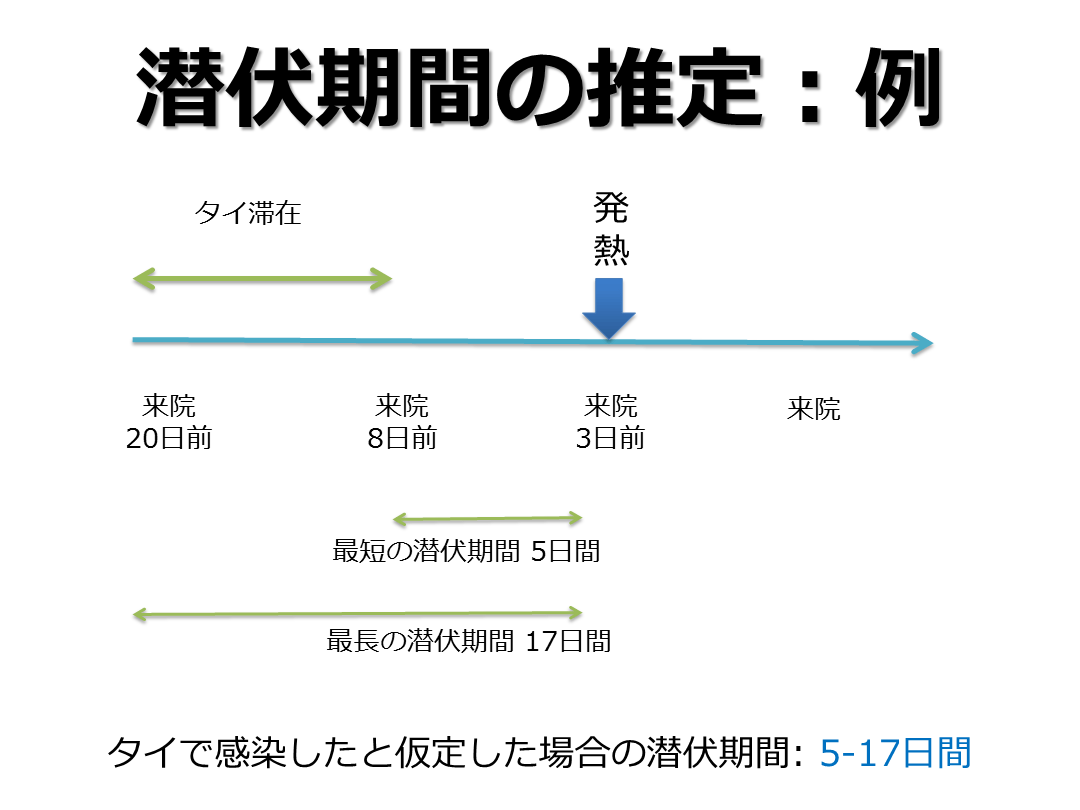 タイ滞在 発熱 最短の潜伏期間 5日間 最長の潜伏期間 17日間 タイで感染したと仮定した場合の潜伏期間: 5-17日間
