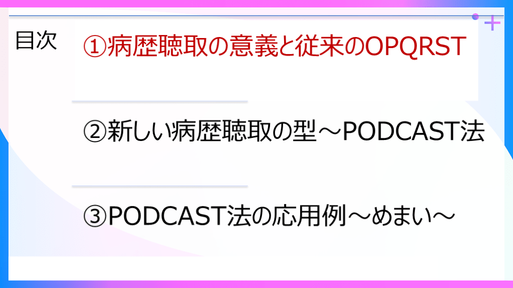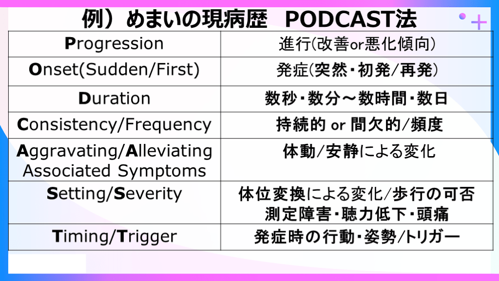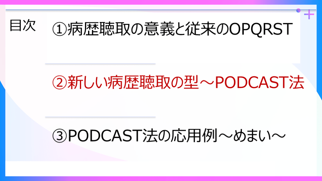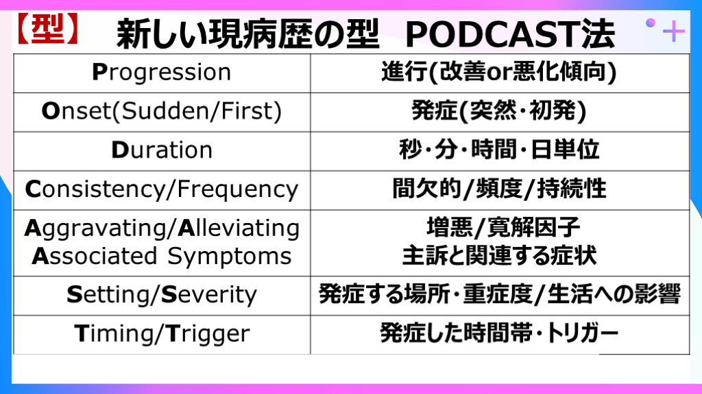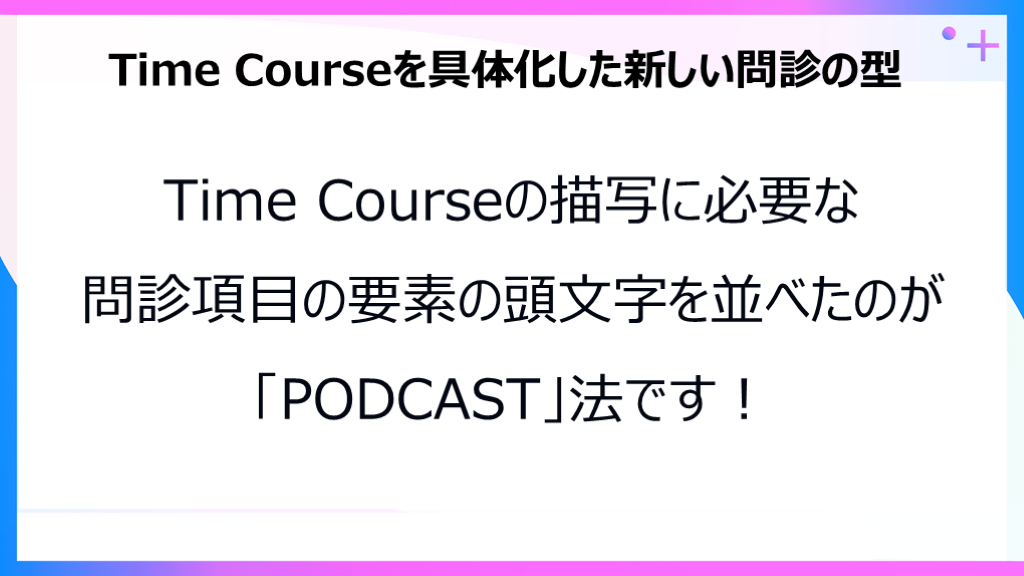 「PODCAST」法です! Time Courseを具体化した新しい問診の型