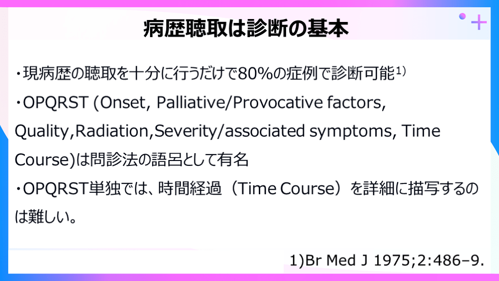 #6. 1)Br Med J 1975;2:486–9. ・現病歴の聴取を十分に行うだけで80%の症例で診断可能1)・OPQRST (Onset, Palliative/Provocative factors, Quality,Radiation,Severity/associated symptoms, Time Course)は問診法の語呂として有名・OPQRST単独では、時間経過(Time Course)を詳細に描写するのは難しい。 病歴聴取は診断の基本