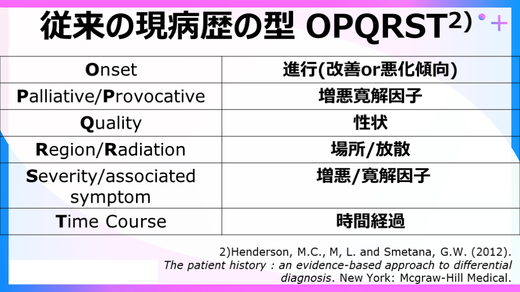 #7. 従来の現病歴の型 OPQRST2) 2)Henderson, M.C., M, L. and Smetana, G.W. (2012).