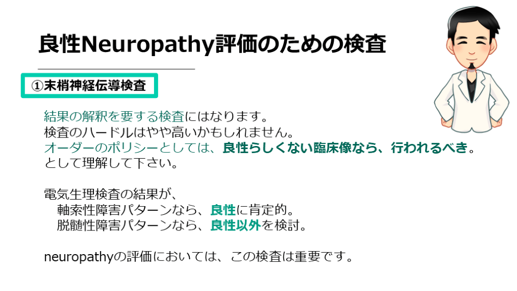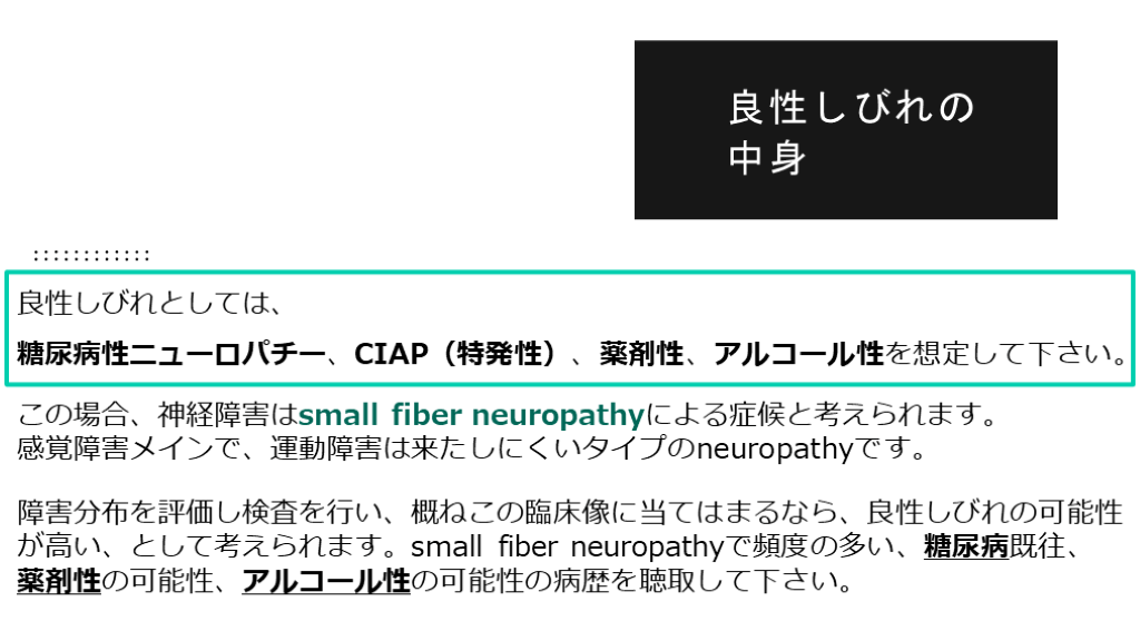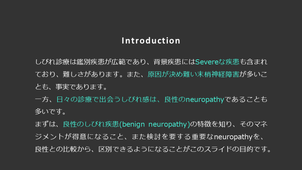 まずは、良性のしびれ疾患(benign neuropathy)の特徴を知り、そのマネジメントが得意になること、また検討を要する重要なneuropathyを、 良性との比較から、区別できるようになることがこのスライドの目的です。