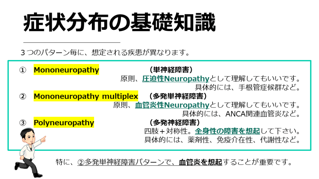 特に、②多発単神経障害パターンで、血管炎を想起することが重要です。