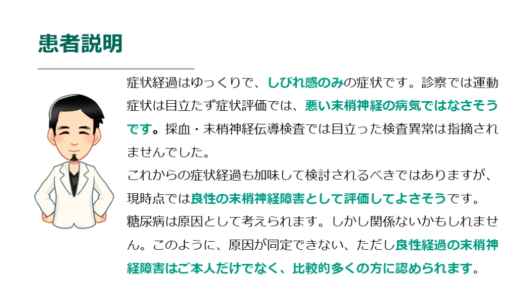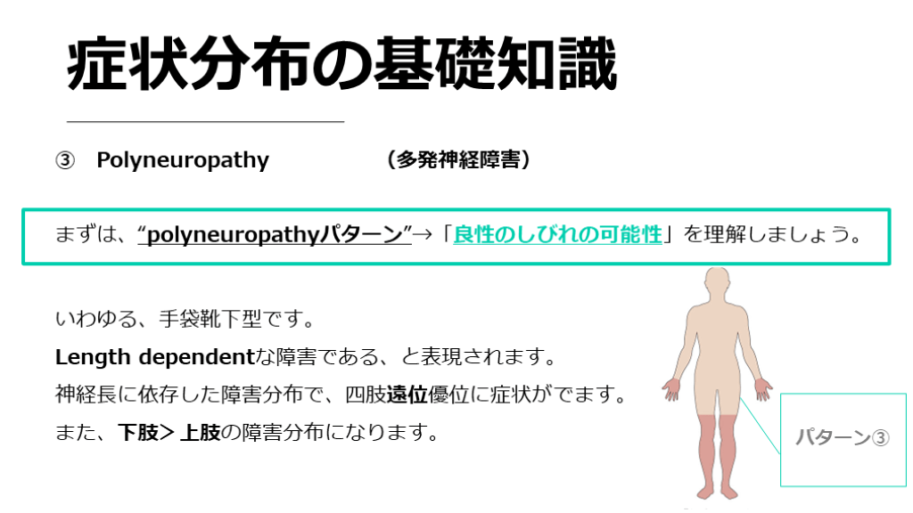 まずは、“polyneuropathyパターン”→「良性のしびれの可能性」を理解しましょう。