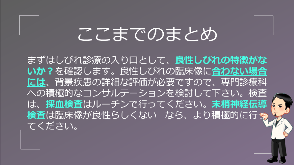 まずはしびれ診療の入り口として、良性しびれの特徴がないか?を確認します。良性しびれの臨床像に合わない場合には、背景疾患の詳細な評価が必要ですので、専門診療科への積極的なコンサルテーションを検討して下さい。検査は、採血検査はルーチンで行ってください。末梢神経伝導検査は臨床像が良性らしくない なら、より積極的に行ってください。