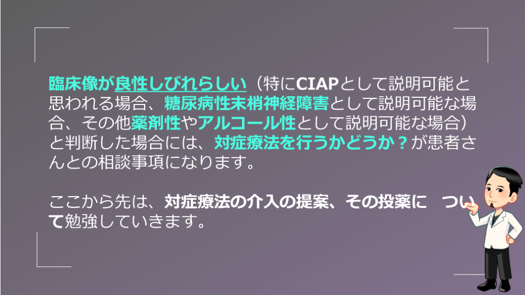 #18. 臨床像が良性しびれらしい(特にCIAPとして説明可能と思われる場合、糖尿病性末梢神経障害として説明可能な場合、その他薬剤性やアルコール性として説明可能な場合)と判断した場合には、対症療法を行うかどうか?が患者さんとの相談事項になります。