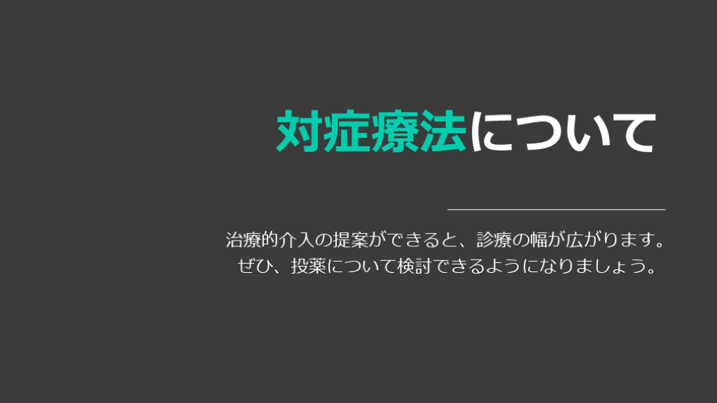 ここから先は、対症療法の介入の提案、その投薬に ついて勉強していきます。