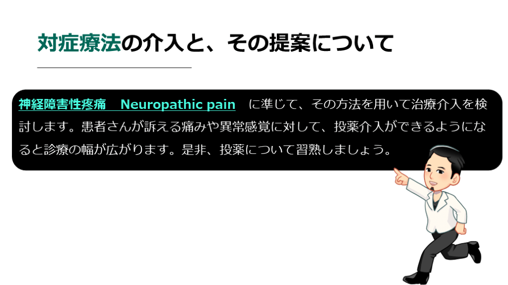 #20. 対症療法の介入と、その提案について 神経障害性疼痛 Neuropathic pain に準じて、その方法を用いて治療介入を検討します。患者さんが訴える痛みや異常感覚に対して、投薬介入ができるようになると診療の幅が広がります。是非、投薬について習熟しましょう。
