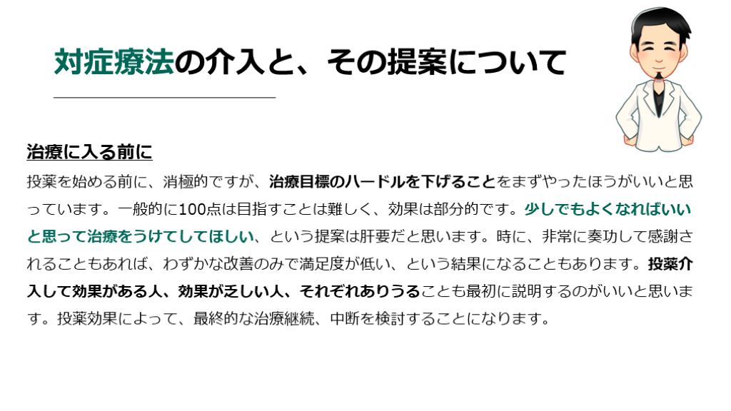 投薬を始める前に、消極的ですが、治療目標のハードルを下げることをまずやったほうがいいと思っています。一般的に100点は目指すことは難しく、効果は部分的です。少しでもよくなればいいと思って治療をうけてしてほしい、という提案は肝要だと思います。時に、非常に奏功して感謝されることもあれば、わずかな改善のみで満足度が低い、という結果になることもあります。投薬介入して効果がある人、効果が乏しい人、それぞれありうることも最初に説明するのがいいと思います。投薬効果によって、最終的な治療継続、中断を検討することになります。