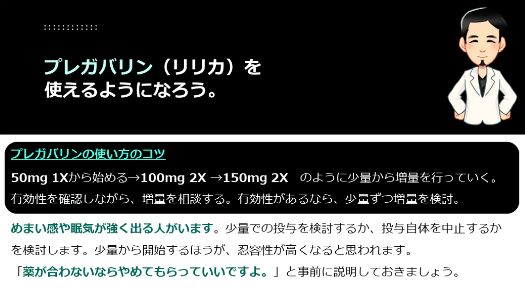 「薬が合わないならやめてもらっていいですよ。」と事前に説明しておきましょう。 プレガバリン(リリカ)を