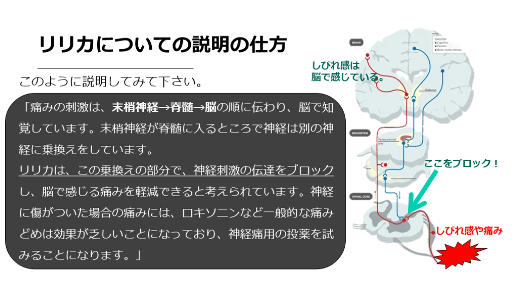 リリカは、この乗換えの部分で、神経刺激の伝達をブロックし、脳で感じる痛みを軽減できると考えられています。神経に傷がついた場合の痛みには、ロキソニンなど一般的な痛みどめは効果が乏しいことになっており、神経痛用の投薬を試みることになります。」