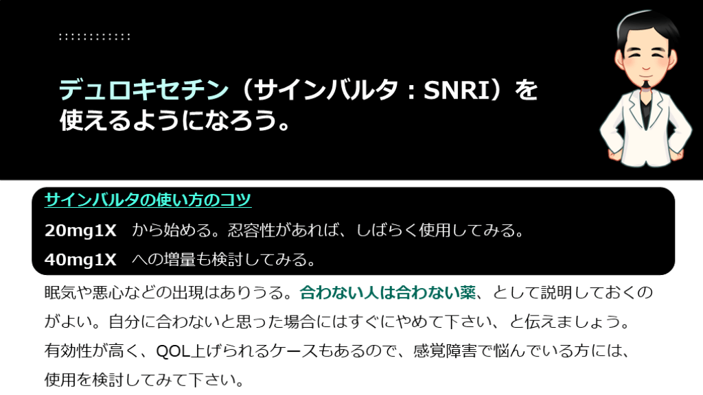 眠気や悪心などの出現はありうる。合わない人は合わない薬、として説明しておくのがよい。自分に合わないと思った場合にはすぐにやめて下さい、と伝えましょう。 有効性が高く、QOL上げられるケースもあるので、感覚障害で悩んでいる方には、 使用を検討してみて下さい。 デュロキセチン(サインバルタ:SNRI)を