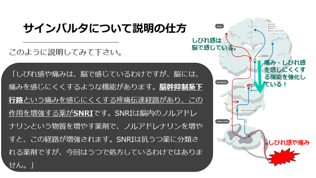 「しびれ感や痛みは、脳で感じているわけですが、脳には、痛みを感じにくくするような機能があります。脳幹抑制系下行路という痛みを感じにくくする疼痛伝達経路があり、この作用を増強する薬がSNRIです。SNRIは脳内のノルアドレナリンという物質を増やす薬剤で、ノルアドレナリンを増やすと、この経路が増強されます。SNRIは抗うつ薬に分類される薬剤ですが、今回はうつで処方しているわけではありません。」