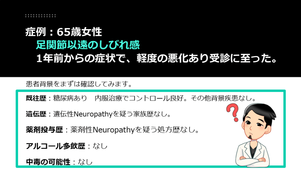 糖尿病性ニューロパチー、CIAP(特発性)、薬剤性、アルコール性を想定して下さい。