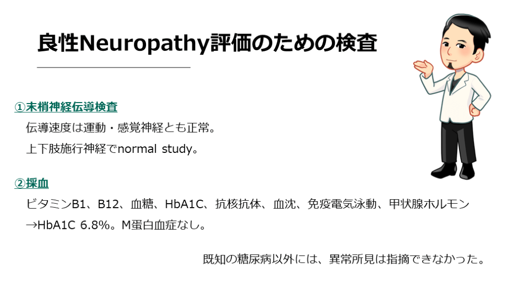 薬剤投与歴:薬剤性Neuropathyを疑う処方歴なし。