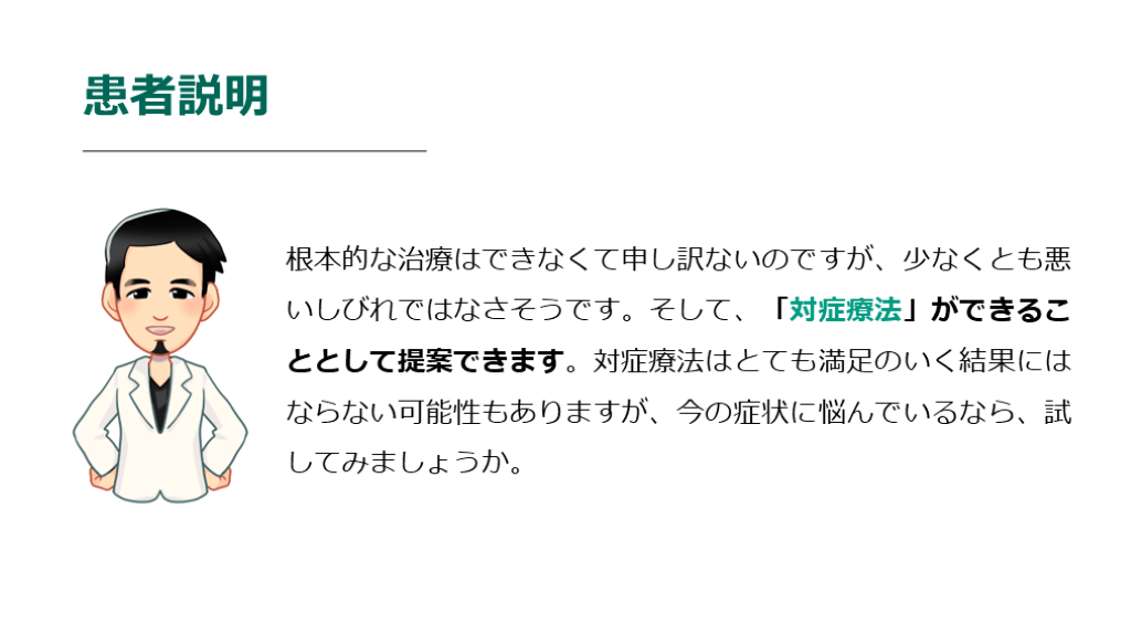 #31. 患者説明 根本的な治療はできなくて申し訳ないのですが、少なくとも悪いしびれではなさそうです。そして、「対症療法」ができることとして提案できます。対症療法はとても満足のいく結果にはならない可能性もありますが、今の症状に悩んでいるなら、試してみましょうか。