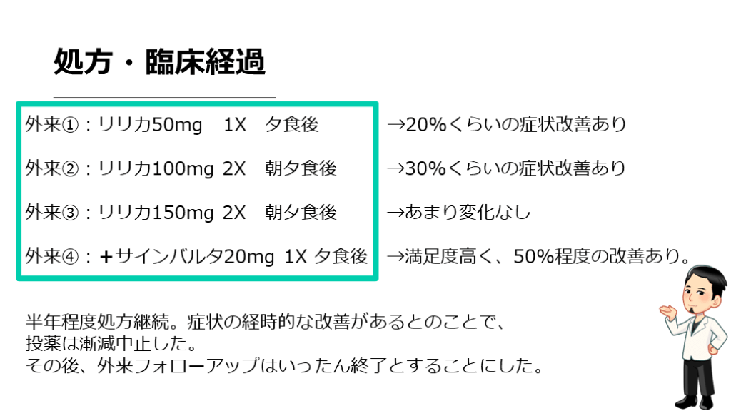 #32. 処方・臨床経過 外来①:リリカ50mg 1X 夕食後 →20%くらいの症状改善あり