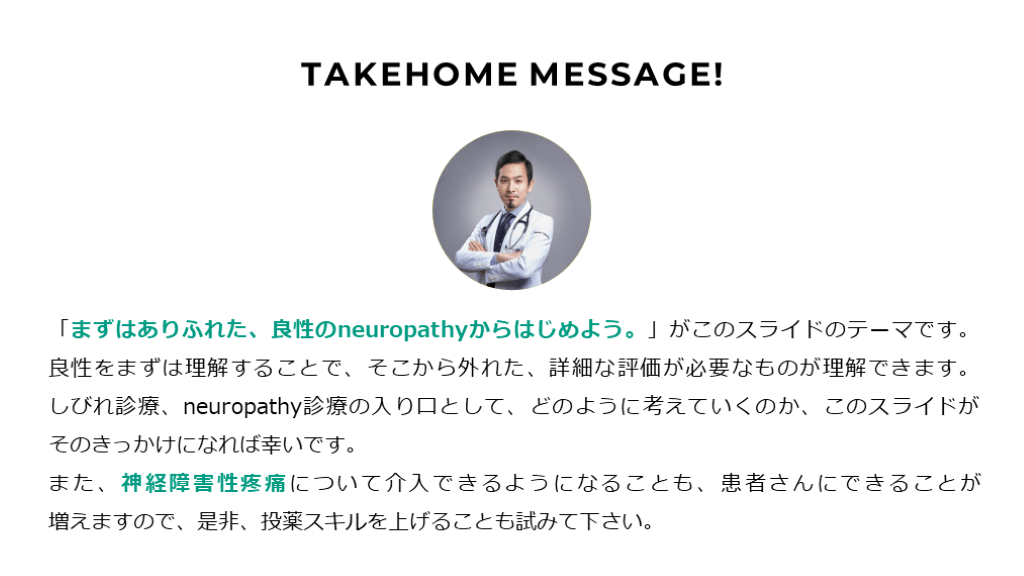また、神経障害性疼痛について介入できるようになることも、患者さんにできることが 増えますので、是非、投薬スキルを上げることも試みて下さい。 TAKEHOME MESSAGE!