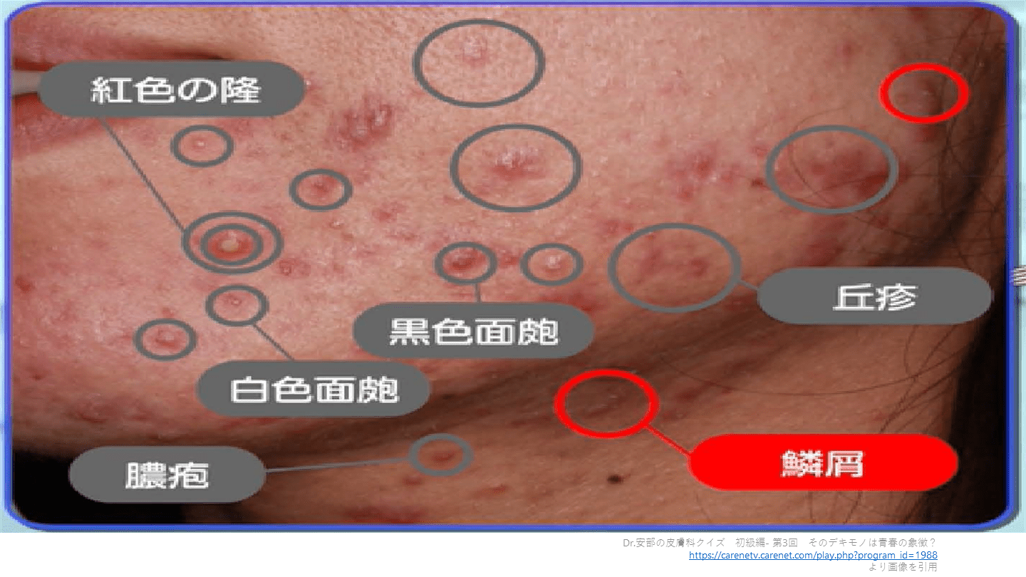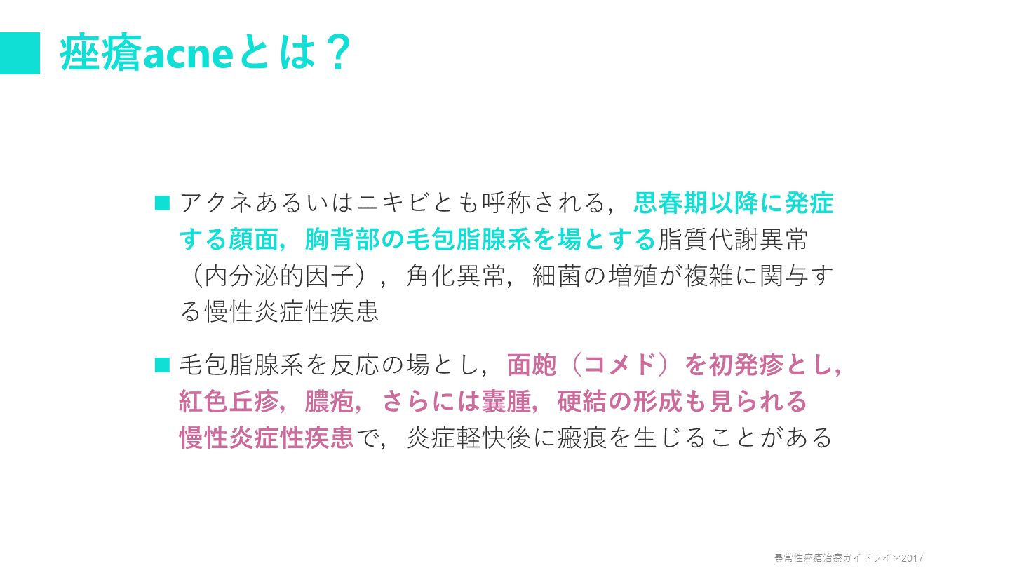 #3. 痤瘡acneとは? アクネあるいはニキビとも呼称される,思春期以降に発症する顔面,胸背部の毛包脂腺系を場とする脂質代謝異常(内分泌的因子),角化異常,細菌の増殖が複雑に関与する慢性炎症性疾患