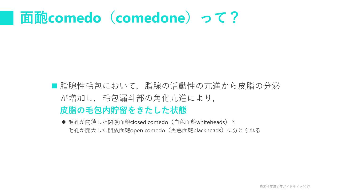 毛孔が閉鎖した閉鎖面皰closed comedo(白色面皰whiteheads)と毛孔が開大した開放面皰open comedo(黒色面皰blackheads)に分けられる 尋常性痤瘡治療ガイドライン2017