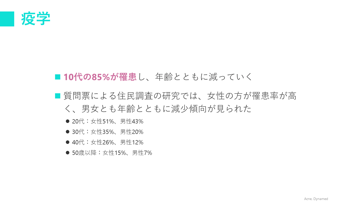 #6. 疫学 Acne, Dynamed 10代の85%が罹患し、年齢とともに減っていく