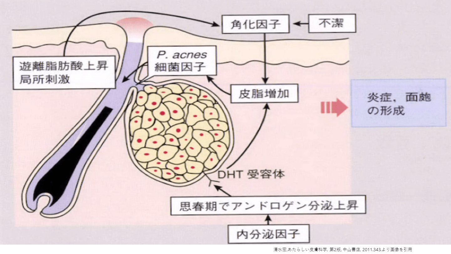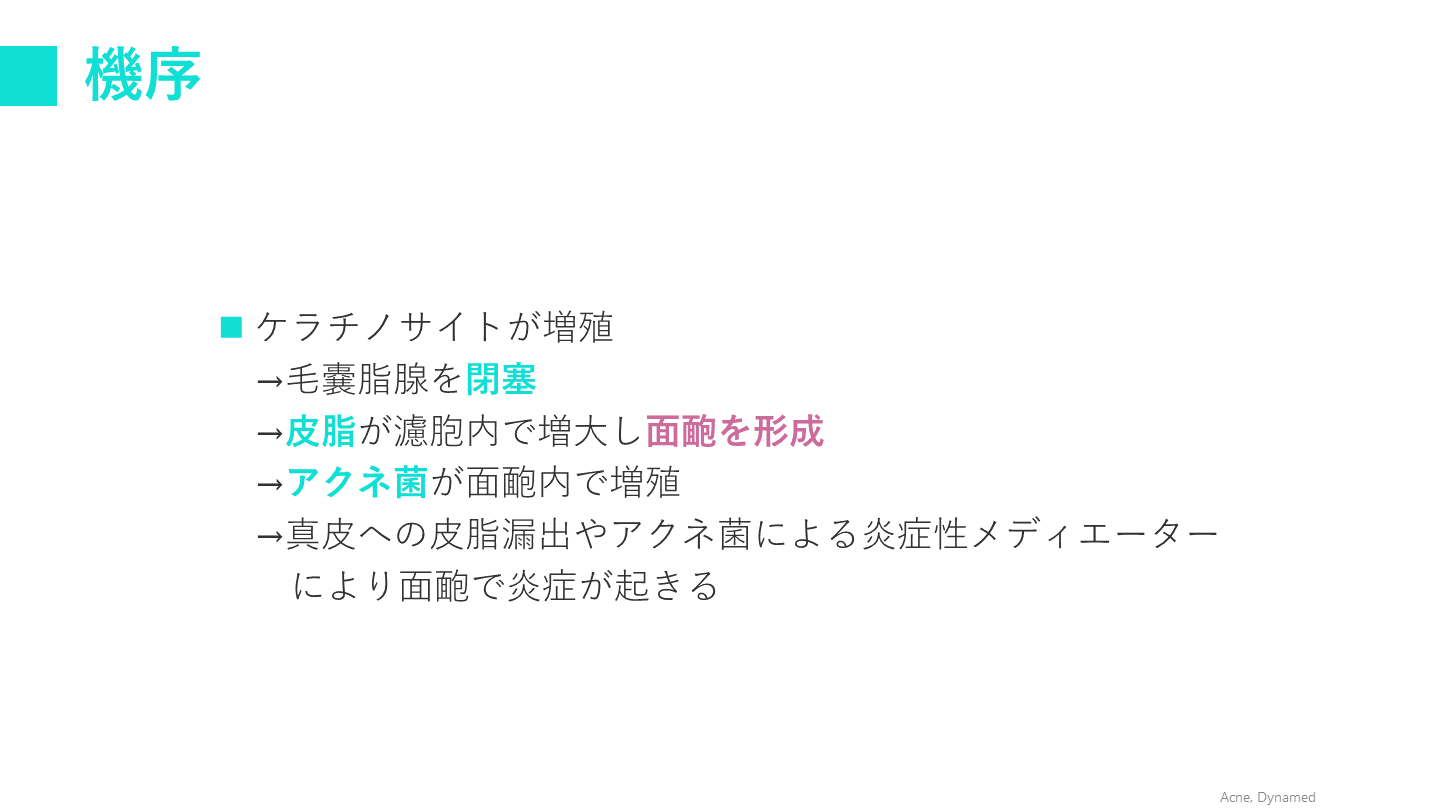 #7. 機序 Acne, Dynamed ケラチノサイトが増殖→毛嚢脂腺を閉塞→皮脂が濾胞内で増大し面靤を形成→アクネ菌が面靤内で増殖→真皮への皮脂漏出やアクネ菌による炎症性メディエーター  により面靤で炎症が起きる