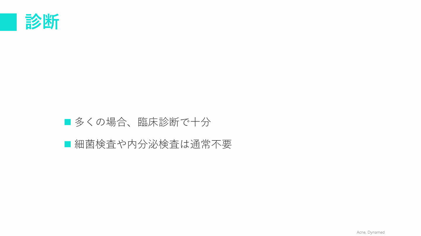 #13. 診断 Acne, Dynamed 多くの場合、臨床診断で十分