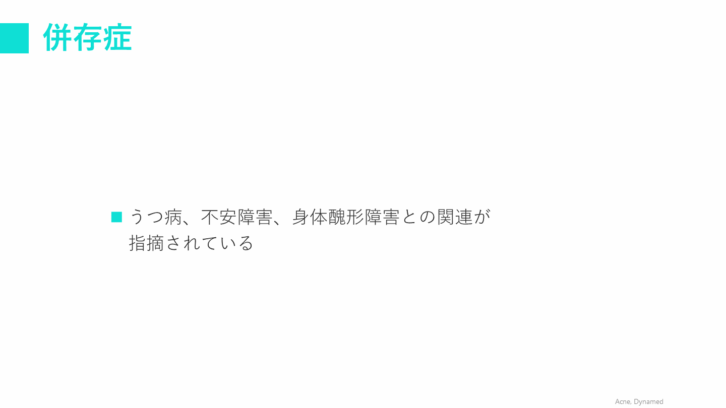 #14. 併存症 Acne, Dynamed うつ病、不安障害、身体醜形障害との関連が指摘されている