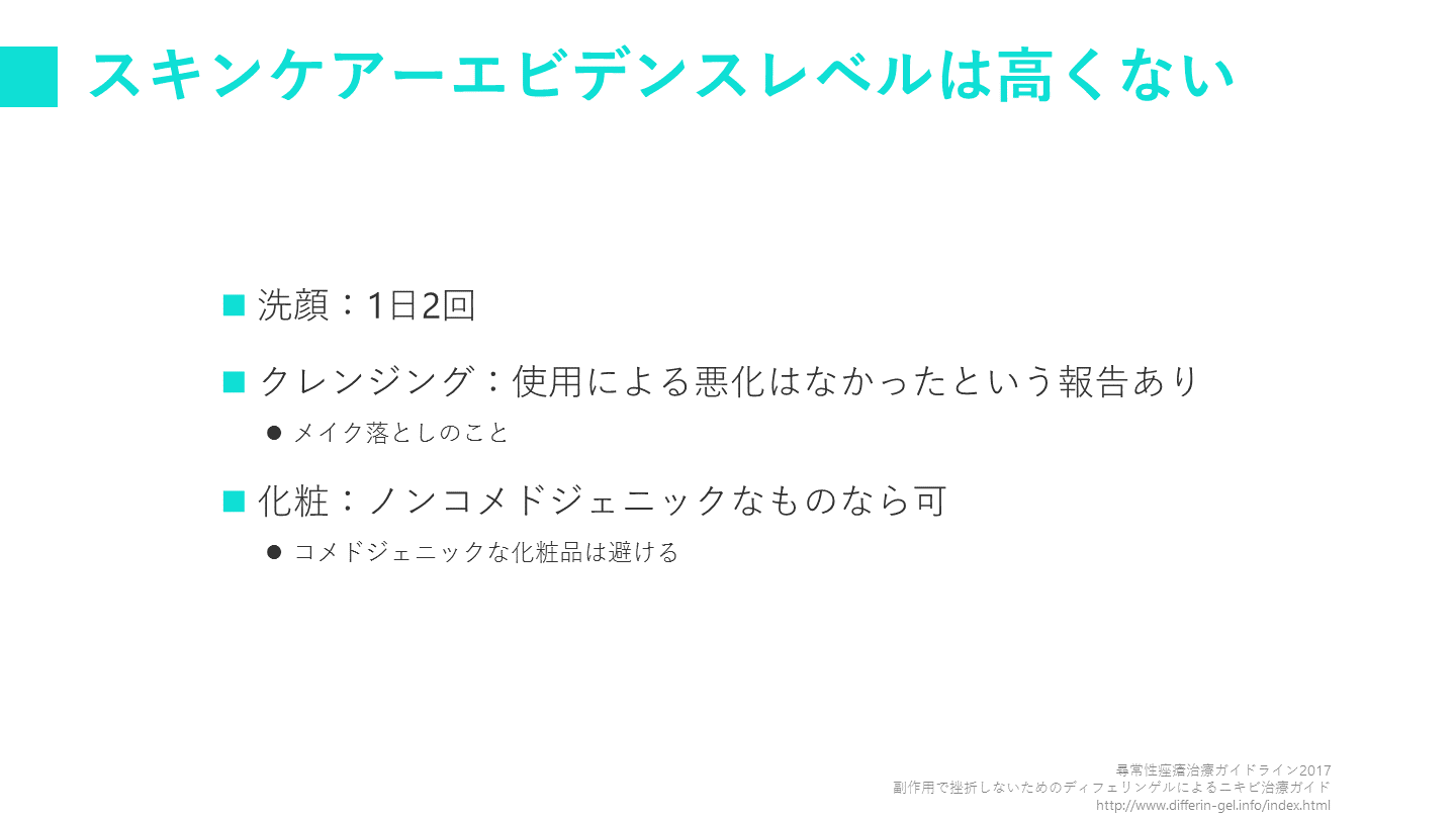 スキンケア(推奨度は高くないが) 炎症がない or 軽度のとき 外用抗菌薬