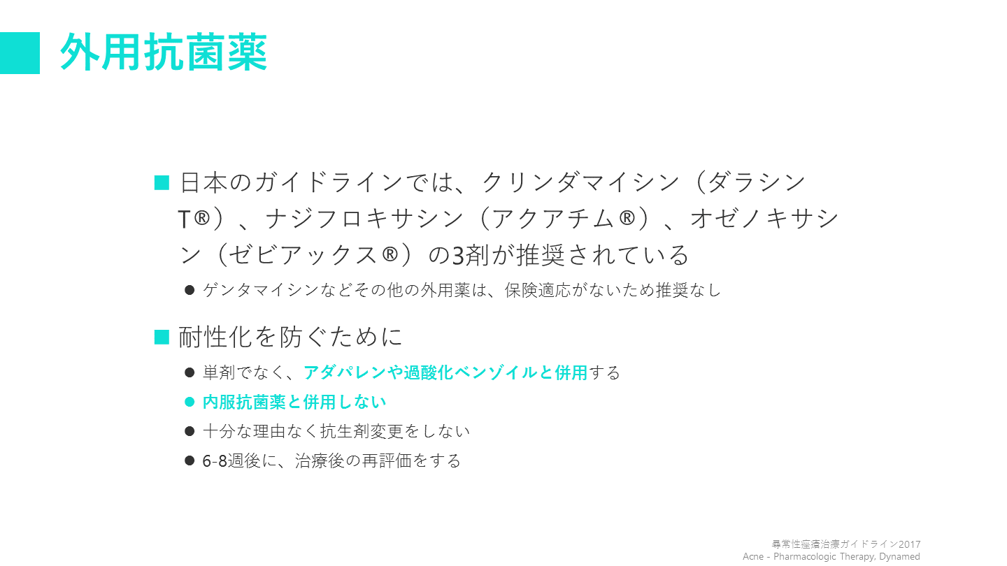 Acne - Pharmacologic Therapy, Dynamed 日本のガイドラインでは、クリンダマイシン(ダラシンT®)、ナジフロキサシン(アクアチム®)、オゼノキサシン(ゼビアックス®)の3剤が推奨されている
