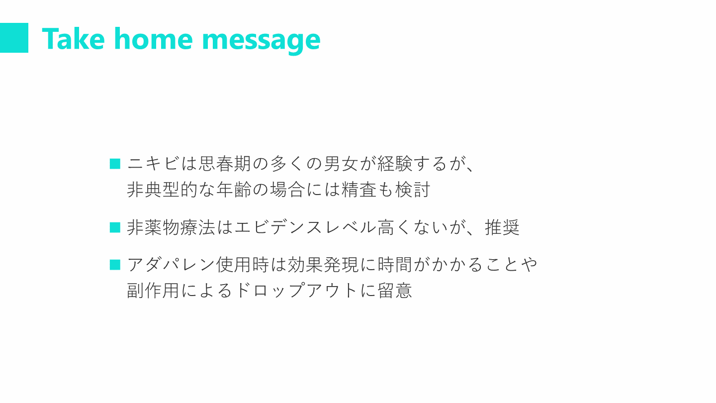 #31. Take home message ニキビは思春期の多くの男女が経験するが、非典型的な年齢の場合には精査も検討