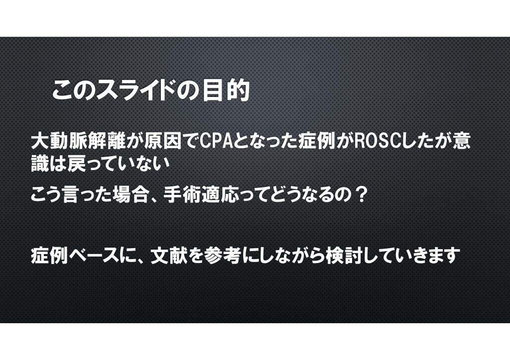 急性大動脈解離が原因で心肺停止(CPA)から心拍再開(ROSC)を果たした69歳女性のケースに基づいて、手術適応について考察します。患者は意識喪失後、救命措置を受けつつ、心嚢液貯留と右総頸動脈の解離が確認されました。手術後は深鎮静及び体温管理療法で経過観察し、意識が覚醒、リハビリを経て社会復帰を果たしました。この症例を通じて、急性大動脈解離によるCPAの手術成績とその後の回復可能性について紹介します。