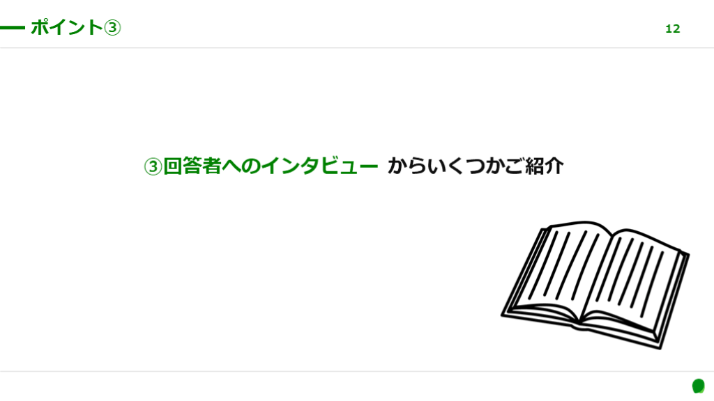 #12. ③回答者へのインタビュー からいくつかご紹介 ポイント③ 12