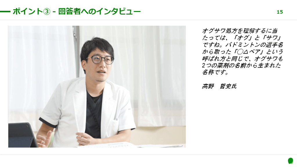 #15. オグサワ処方を理解するに当たっては、「オグ」と「サワ」ですね。バドミントンの選手名から取った「◯△ペア」という呼ばれ方と同じで、オグサワも2つの薬剤の名前から生まれた名称です。