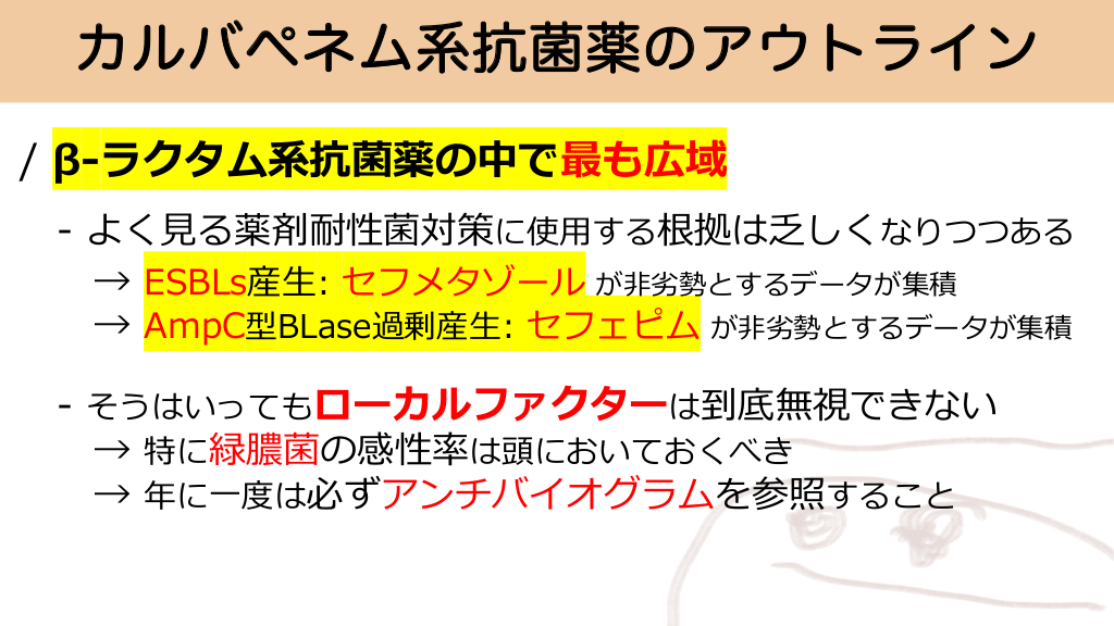 #10. カルバペネム系抗菌薬のアウトライン / β-ラクタム系抗菌薬の中で最も広域 - よく⾒る薬剤耐性菌対策に使⽤する根拠は乏しくなりつつある → ESBLs産⽣: セフメタゾール が⾮劣勢とするデータが集積 → AmpC型BLase過剰産⽣: セフェピム が⾮劣勢とするデータが集積 - そうはいってもローカルファクターは到底無視できない → 特に緑膿菌の感性率は頭においておくべき → 年に⼀度は必ずアンチバイオグラムを参照すること