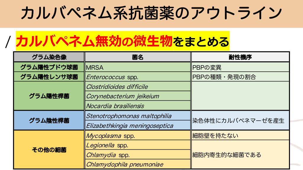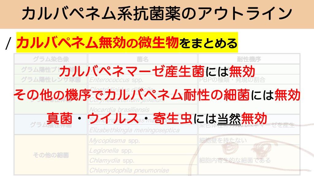 #12. カルバペネム系抗菌薬のアウトライン / カルバペネム無効の微⽣物をまとめる カルバペネマーゼ産生菌には無効 その他の機序でカルバペネム耐性の細菌には無効 真菌・ウイルス・寄生虫には当然無効