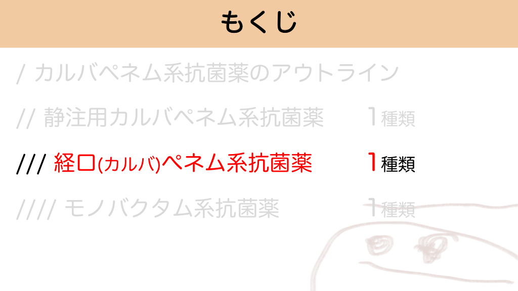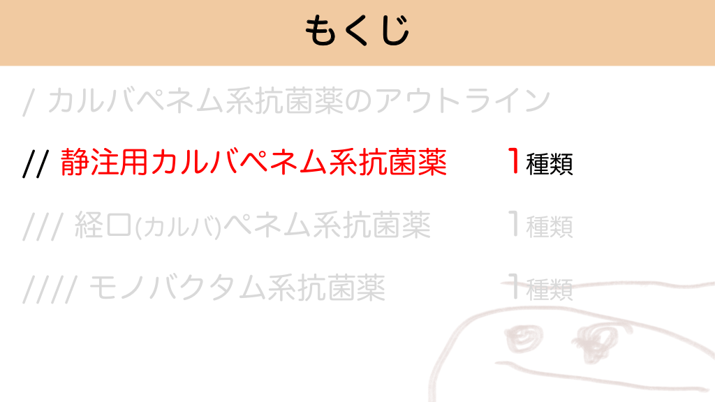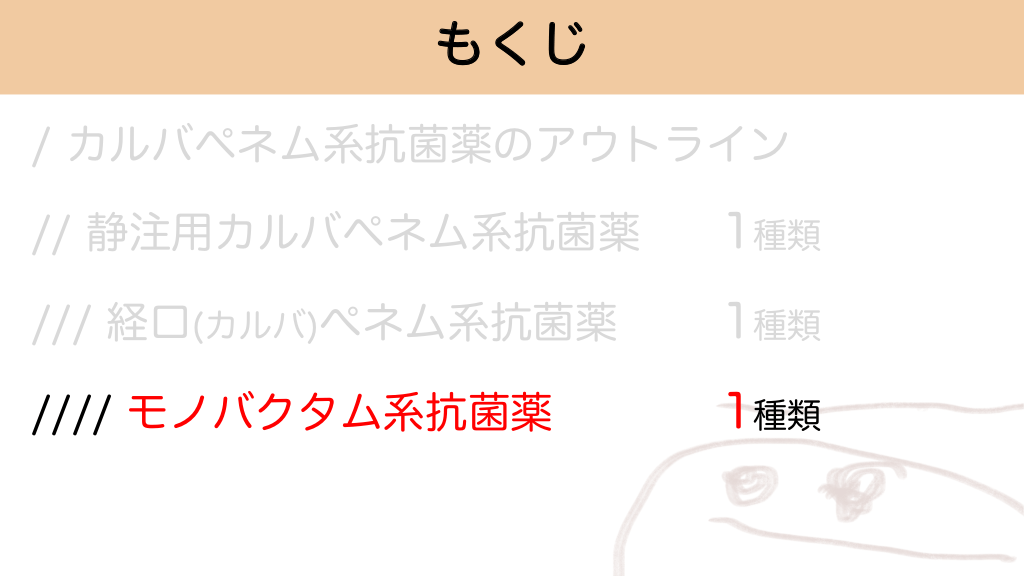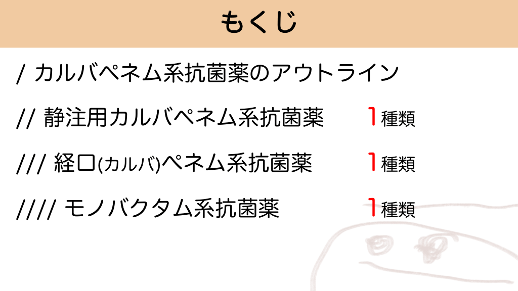 #4. もくじ / カルバペネム系抗菌薬のアウトライン // 静注用カルバペネム系抗菌薬 1種類 /// 経口(カルバ)ぺネム系抗菌薬 1種類 //// モノバクタム系抗菌薬 1種類
