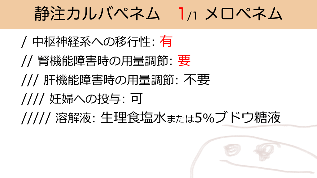 #14. 静注カルバペネム 1/1 メロぺネム / 中枢神経系への移⾏性: 有 // 腎機能障害時の⽤量調節: 要 /// 肝機能障害時の⽤量調節: 不要 //// 妊婦への投与: 可 ///// 溶解液: ⽣理⾷塩⽔または5%ブドウ糖液