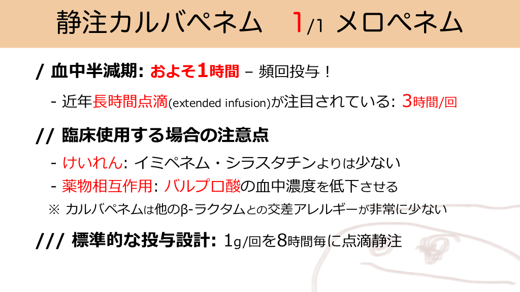 #15. 静注カルバペネム 1/1 メロぺネム / ⾎中半減期: およそ1時間 – 頻回投与︕ - 近年⻑時間点滴(extended infusion)が注⽬されている: 3時間/回 // 臨床使⽤する場合の注意点 - けいれん: イミペネム・シラスタチンよりは少ない - 薬物相互作⽤: バルプロ酸の⾎中濃度を低下させる ※ カルバペネムは他のβ-ラクタムとの交差アレルギーが⾮常に少ない /// 標準的な投与設計: 1g/回を8時間毎に点滴静注