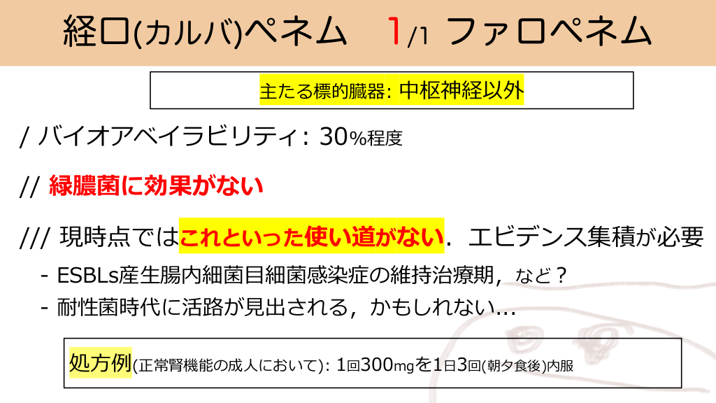 #17. 経口(カルバ)ペネム 1/1 ファロペネム 主たる標的臓器: 中枢神経以外 / バイオアベイラビリティ: 30%程度 // 緑膿菌に効果がない /// 現時点ではこれといった使い道がない.エビデンス集積が必要 - ESBLs産⽣腸内細菌⽬細菌感染症の維持治療期,など︖ - 耐性菌時代に活路が⾒出される,かもしれない... 処⽅例(正常腎機能の成⼈において): 1回300mgを1⽇3回(朝⼣⾷後)内服
