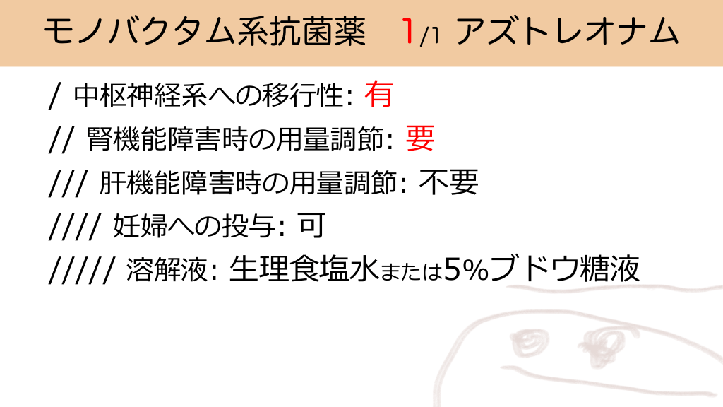 #19. モノバクタム系抗菌薬 1/1 アズトレオナム / 中枢神経系への移⾏性: 有 // 腎機能障害時の⽤量調節: 要 /// 肝機能障害時の⽤量調節: 不要 //// 妊婦への投与: 可 ///// 溶解液: ⽣理⾷塩⽔または5%ブドウ糖液