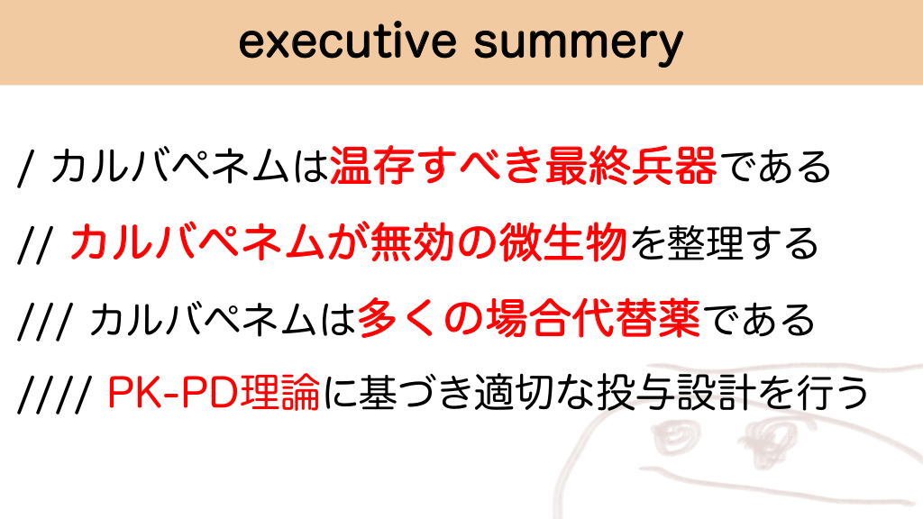 #2. executive summery / カルバペネムは温存すべき最終兵器である // カルバペネムが無効の微生物を整理する /// カルバペネムは多くの場合代替薬である //// PK-PD理論に基づき適切な投与設計を行う