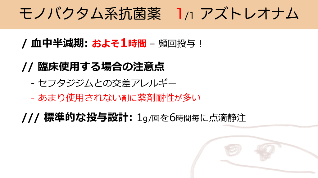 #21. モノバクタム系抗菌薬 1/1 アズトレオナム / ⾎中半減期: およそ1時間 – 頻回投与︕ // 臨床使⽤する場合の注意点 - セフタジジムとの交差アレルギー - あまり使⽤されない割に薬剤耐性が多い /// 標準的な投与設計: 1g/回を6時間毎に点滴静注